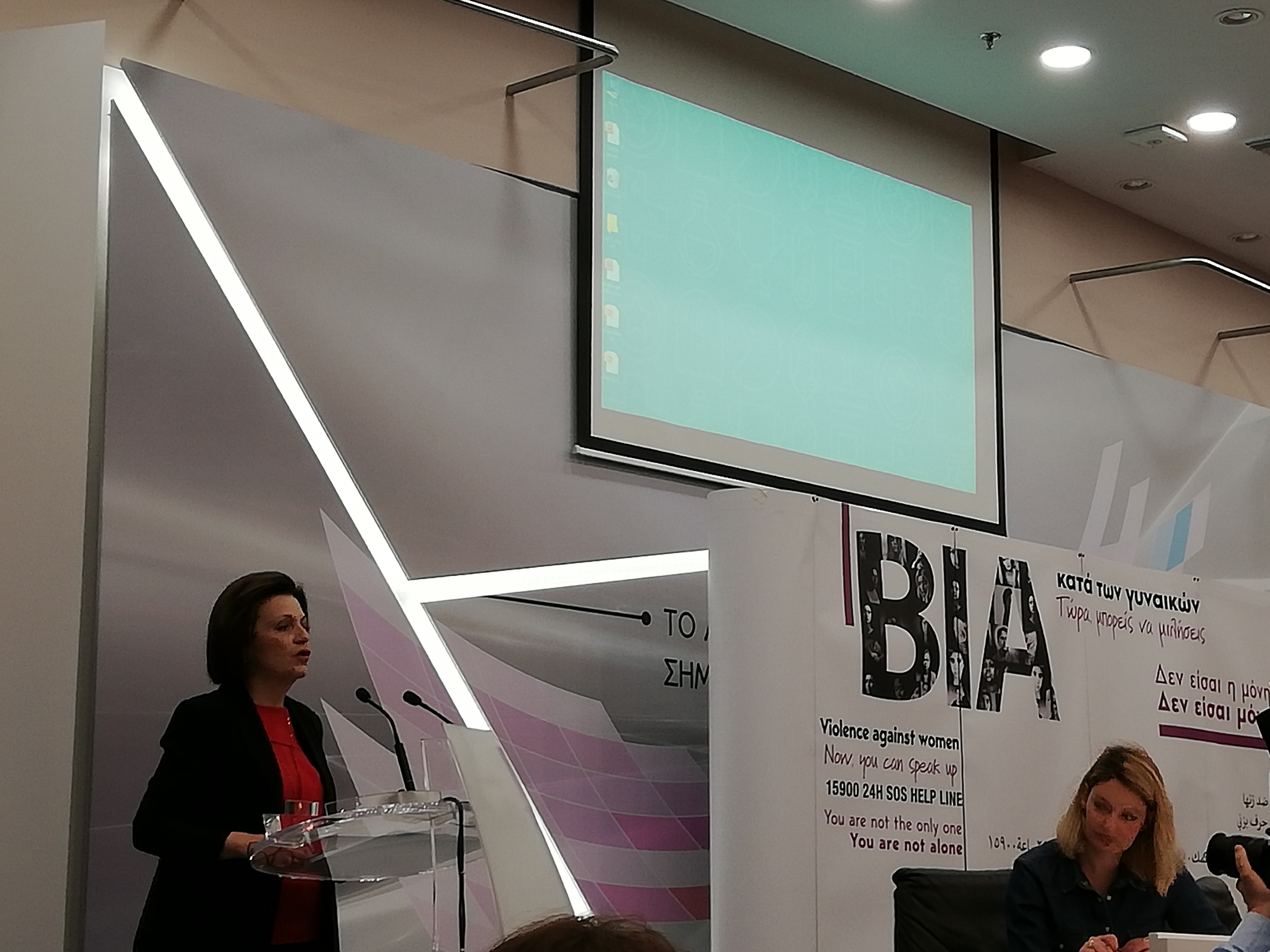 Στην έναρξη της ημερίδας, χαιρετισμό απηύθυνε η Υφυπουργός Εσωτερικών, κ. Μ. Χρυσοβελώνη, αρμόδια για κρατικές πολιτικές έμφυλης ισότητας. Στον χαιρετισμό της, η Υφυπουργός Εσωτερικών μεταξύ άλλων τόνισε πως: «τα τελευταία τέσσερα χρόνια η κυβέρνηση καταβάλει μια τιτάνια προσπάθεια σε όλα τα επίπεδα προκειμένου να βγει η χώρα από την κρίση, να βελτιωθούν όλοι οι οικονομικοί δείκτες, να μειωθεί η ανεργία από την οποία πλήττονται κυρίως οι νέοι και οι γυναίκες, να αποκατασταθεί η αξιοπιστία και το κύρος της χώρας, να αντιμετωπιστούν φαινόμενα διαφθοράς, να λυθούν προβλήματα δεκαετιών και να δημιουργηθεί ένα στέρεο κοινωνικό κράτος με επίκεντρο τον άνθρωπο. Ιδιαίτερα τον πιο αδύναμο, τον πιο ευάλωτο, τον πιο σκληρά δοκιμαζόμενο την τελευταία δεκαετία.» Για να συμπληρώσει πως: «τους μήνες που απομένουν θα προσπαθήσουμε να δημιουργήσουμε μία βάση για το μέλλον σχετικά με τα θέματα ισότητας, πέρα από την αντιμετώπιση της βίας κατά των γυναικών, με επικέντρωση στην ενίσχυση της γυναικείας συνεταιριστικής επιχειρηματικότητας, των γυναικείων επιχειρήσεων εν γένει, καθώς και αυτών της Κοινωνικής και Αλληλέγγυας Οικονομίας, ως πολύ καλό και ελπιδοφόρο πεδίο για τις γυναίκες».