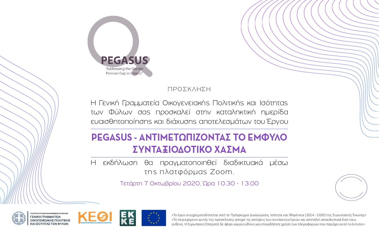 Πρόσκληση και Πρόγραμμα – Καταληκτική ημερίδα ευαισθητοποίησης και διάχυσης αποτελεσμάτων του έργου Pegasus – Αντιμετωπίζοντας το έμφυλο συνταξιοδοτικό χάσμα